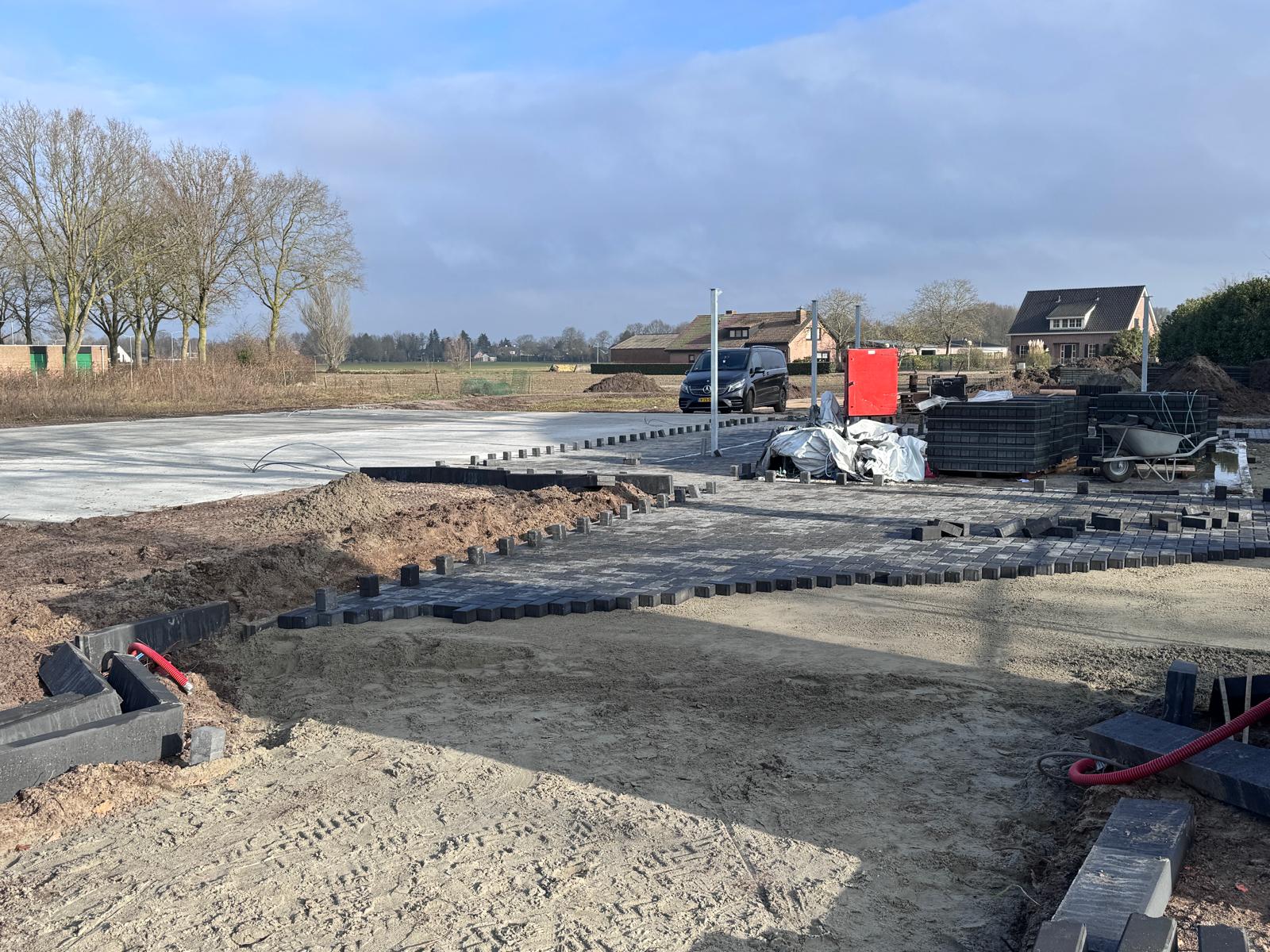 Ondanks de sneeuw zijn vandaag de rijplaten gelegd om de bouwplaats te kunnen bereiken met zwaar materieel.