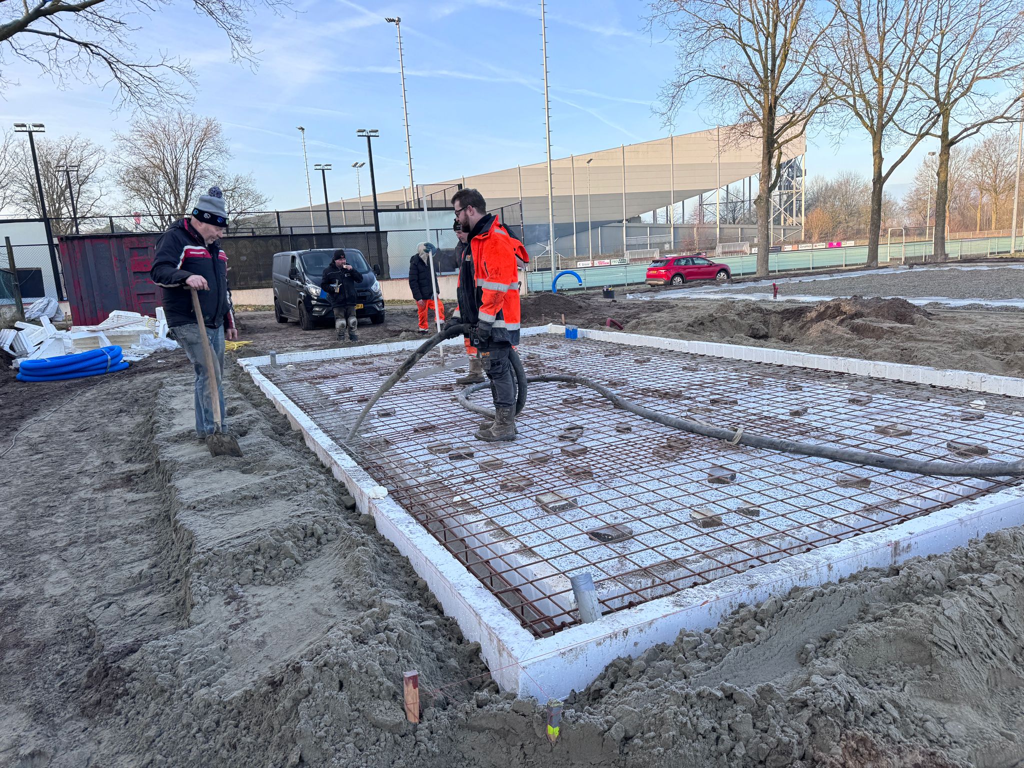 Daarnaast legt J. Valentijn Bestratingen volgende week het extra gesponsorde straatwerk aan. Zodra het hekwerk staat en de temperatuur het toelaat, wordt het kunstgras gelegd, waarmee de baan steeds dichter bij oplevering komt.