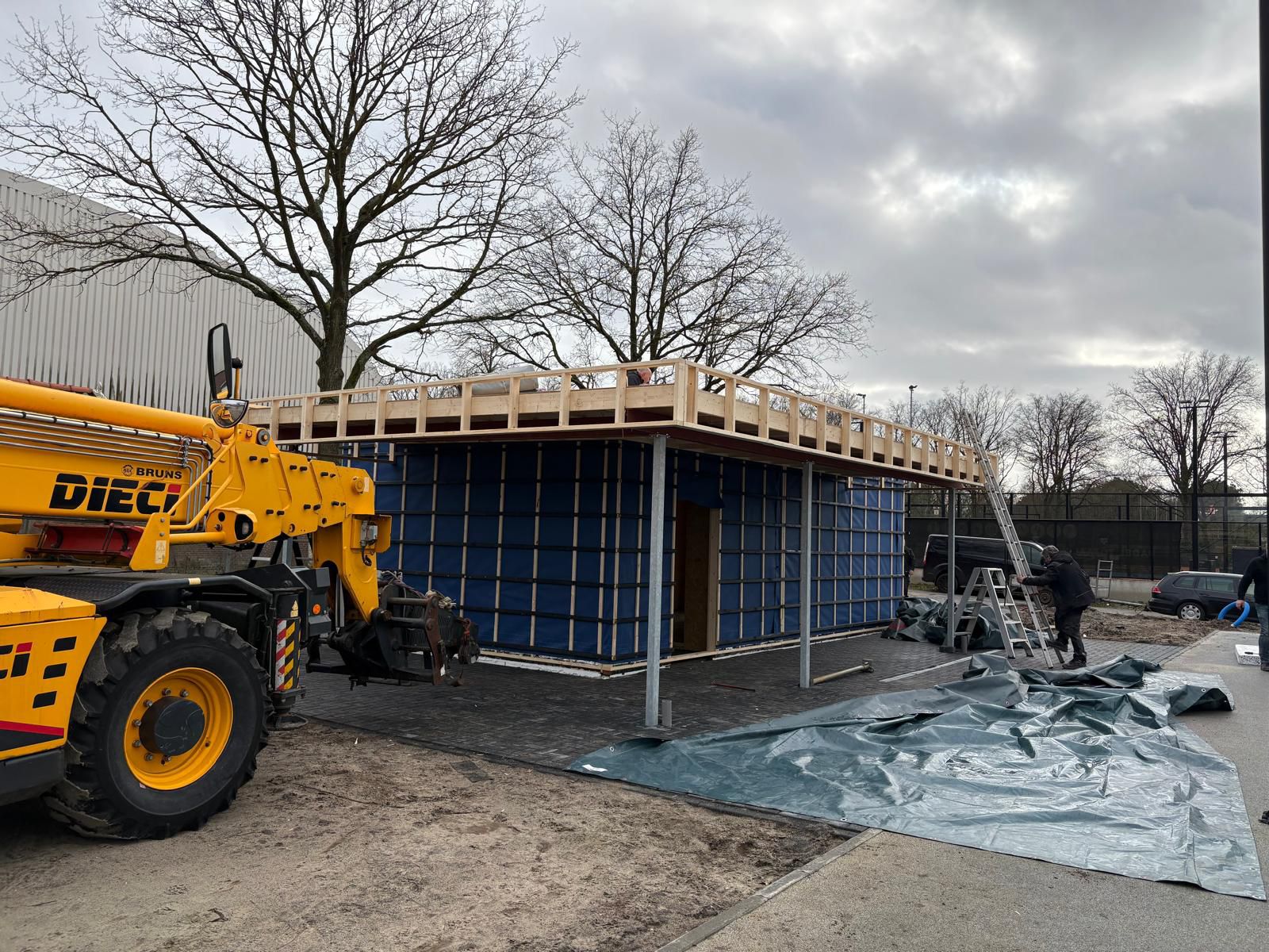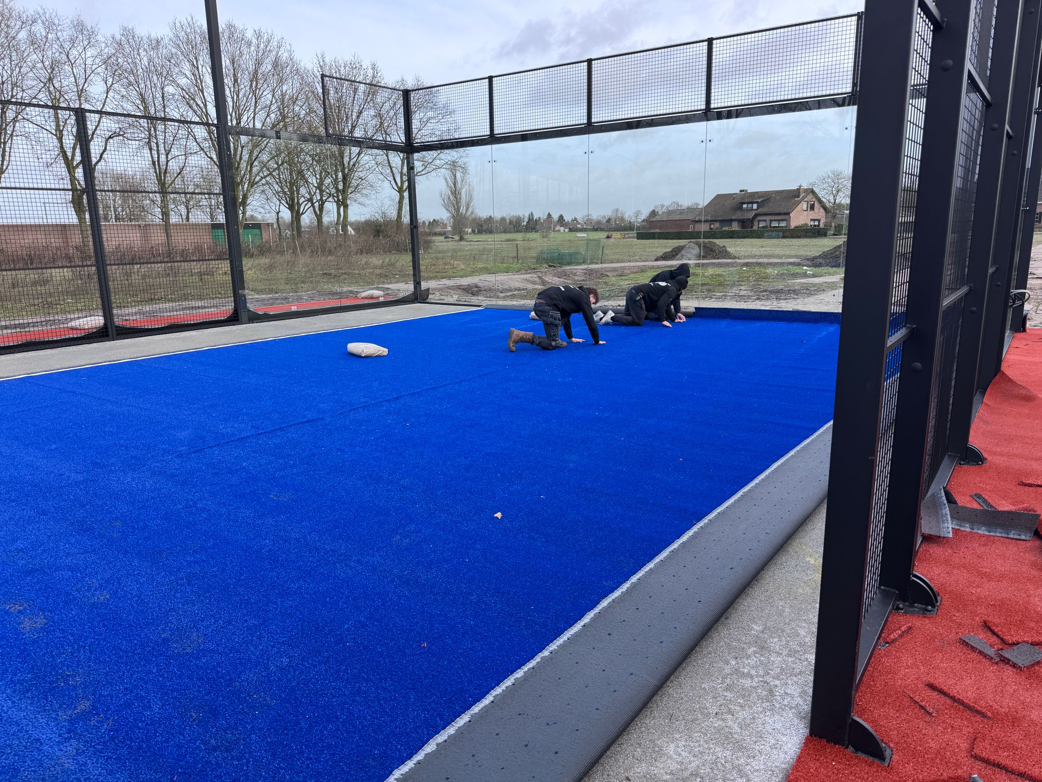 Er zijn weer grote stappen gezet afgelopen weekend! De wanden en het dak van het onderhoudsgebouw zijn geplaatst. Ook is er vandaag weer hard aan de padelbaan gewerkt: het kunstgras is gelegd!