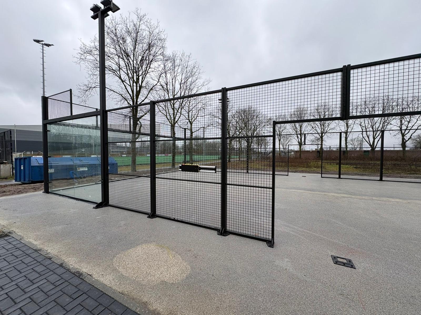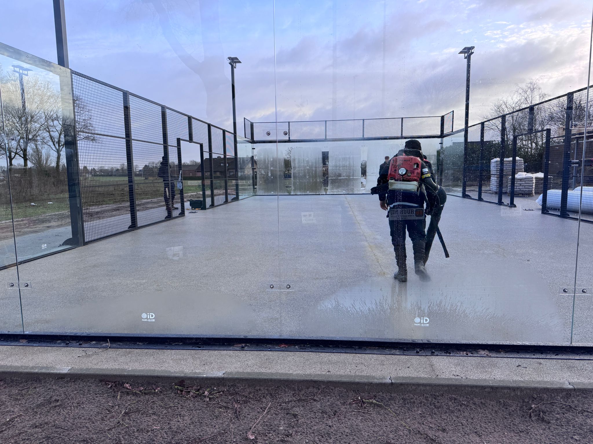 De bouw van de derde padelbaan blijft in hoog tempo doorgaan. Inmiddels zijn de padelkooi en de glaswanden geplaatst, en aanstaande zaterdag volgt de plaatsing van het onderhoudsgebouw. Volgende week wordt het dak voorzien van dakbedekking, waarna in de daaropvolgende weken ook de elektra en beveiliging worden afgerond.