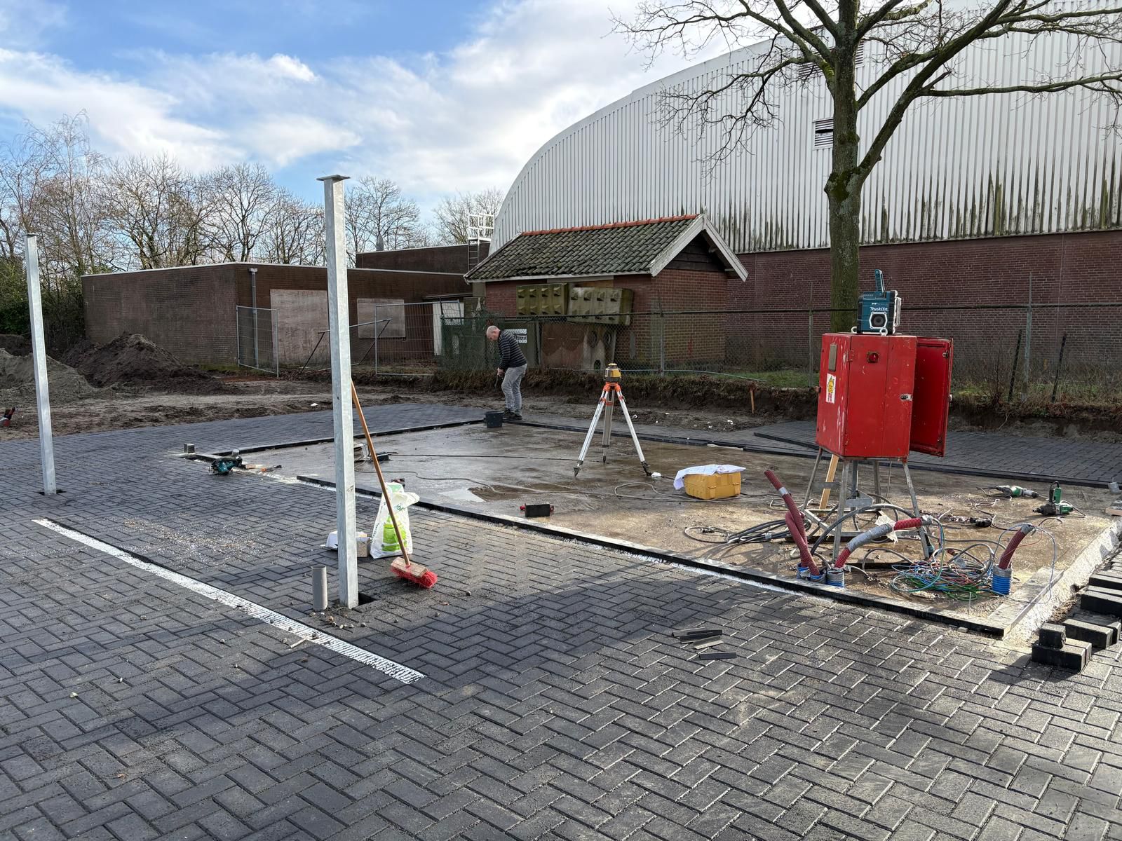Straatwerkzaamheden zijn afgerond. Vandaag zijn we begonnen met het plaatsen van de padelkooi. Materialen staan klaar om de kooi verder op te bouwen deze week. Prefab wandjes van het onderhoudsgebouw staan ook klaar. Deze week wordt het dak van het onderhoudsgebouw voorbereid. Planning is om het weekend van 21 februari de wanden van het onderhoudsgebouw te plaatsen.