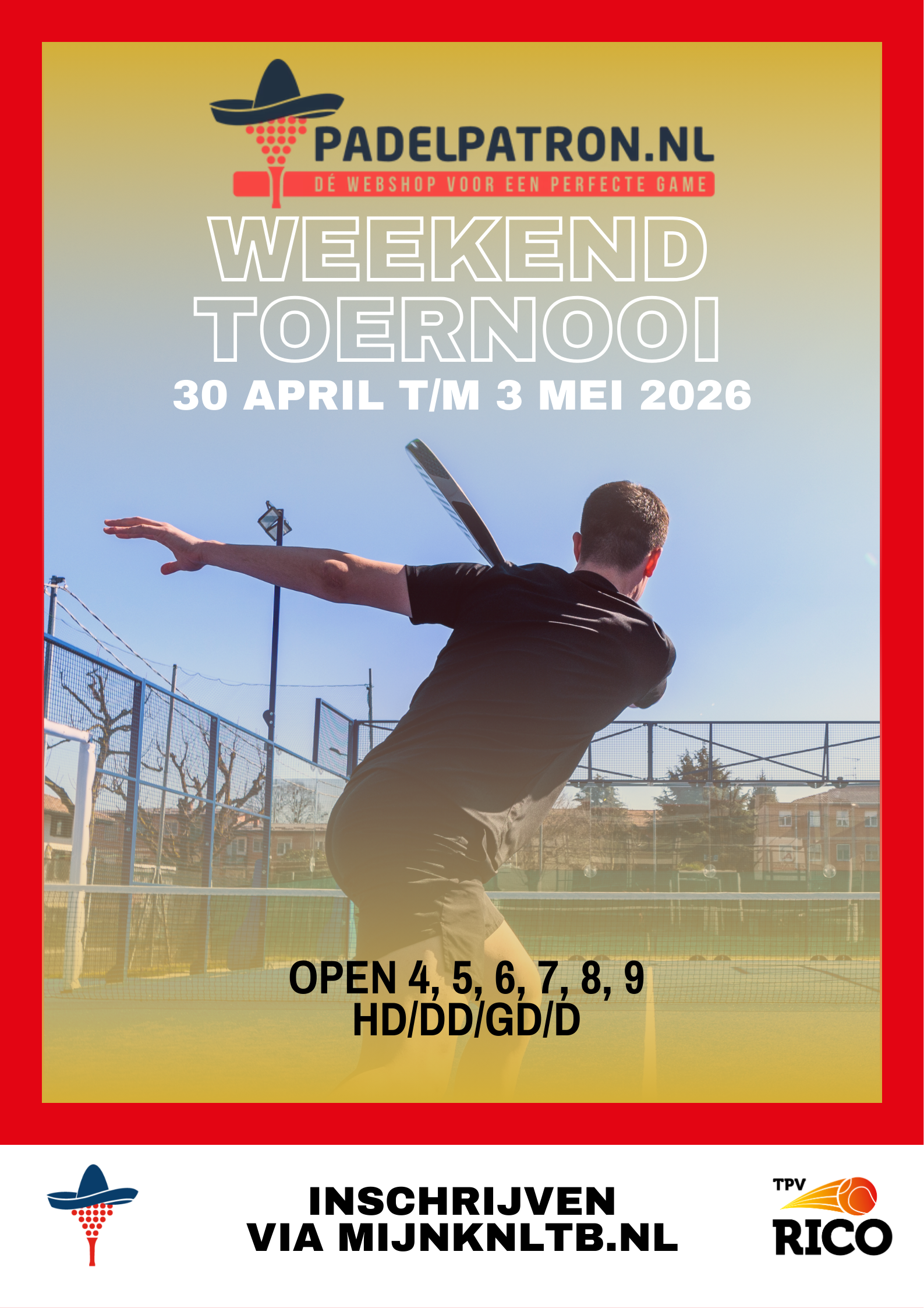 Van 30 april t/m 3 mei spelen we ons jaarlijkse Open PadelPatron Weekendtoernooi. De afgelopen jaren zat het toernooi razendsnel vol, maar dankzij onze derde padelbaan kunnen we dit jaar meer spelers verwelkomen. Toch blijft het: VOL = VOL, dus wacht niet te lang met inschrijven.