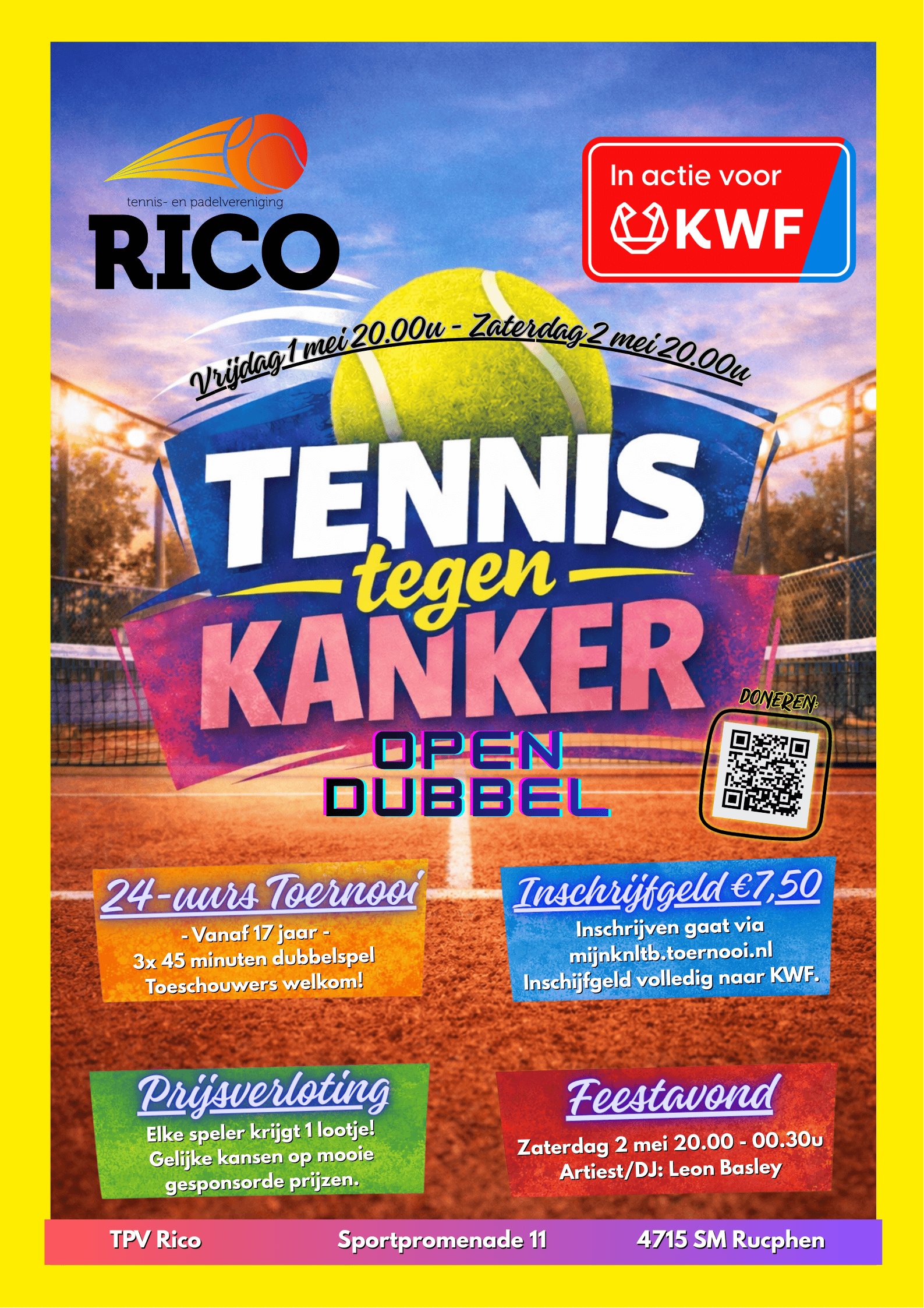 Van vrijdag 1 mei 20:00 tot zaterdag 2 mei 20:00 organiseren we iets bijzonders: een 24-uurs tennistoernooi om geld op te halen voor KWF Kankerbestrijding. Onder het motto Tennis tegen Kanker houden we de banen 24 uur lang bezet met dubbelwedstrijden.