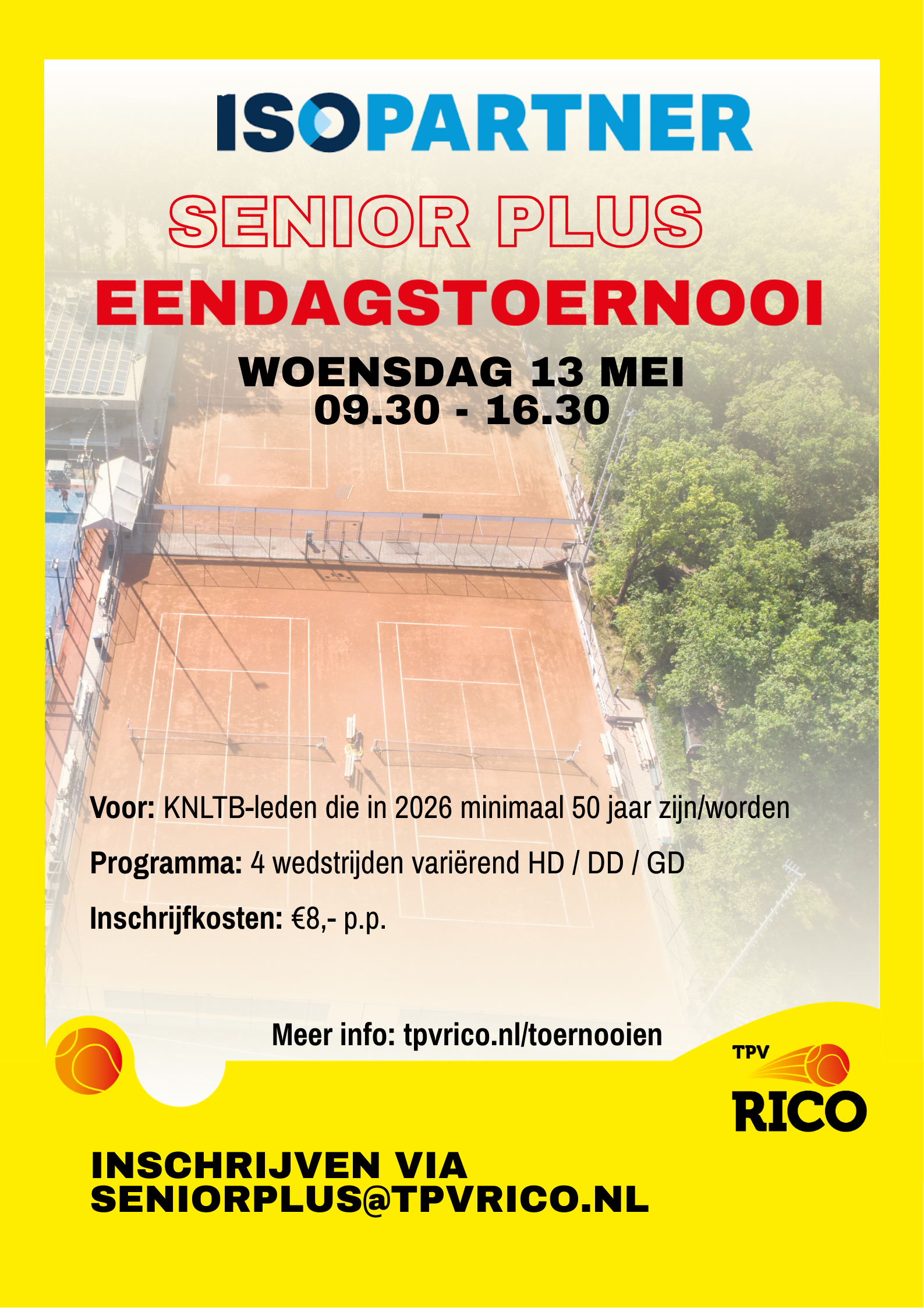 TPV Rico organiseert op woensdag 13 mei wederom een Senior Plus Eendagstoernooi. Het tennistoernooi staat open voor alle KNLTB leden, die in 2026 minimaal 50 jaar zijn of worden.