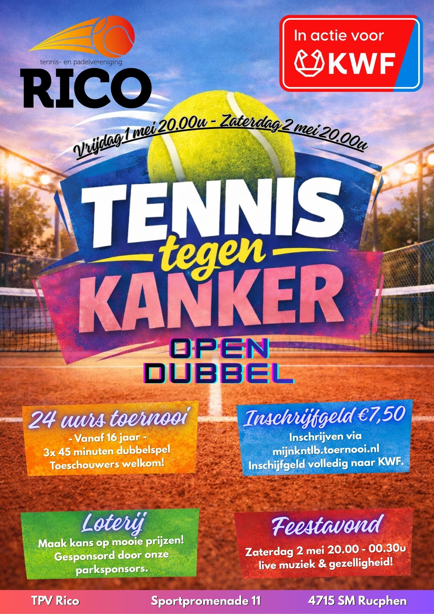 Onder het motto Tennis tegen Kanker houden we de tennisbanen 24 uur lang bezet met dubbelwedstrijden.