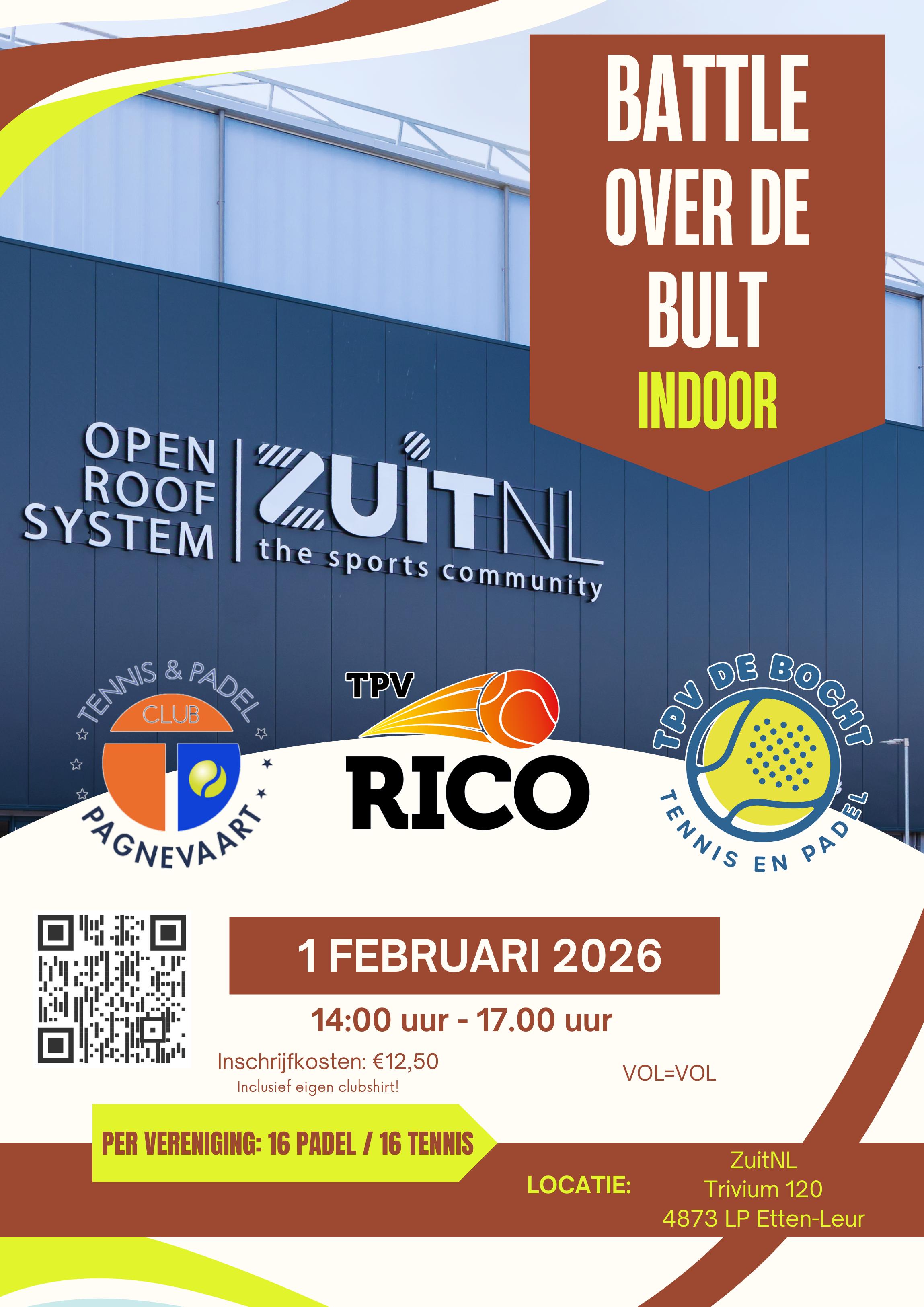 Op zondag 1 februari gaan leden van TPV de Bocht, TPC Pagnevaart, en TPV Rico de onderlinge strijd aan. Help jij TPV Rico aan de winst van de tweede Indoor editie van Battle over de Bult? Schrijf je snel in want VOL=VOL!